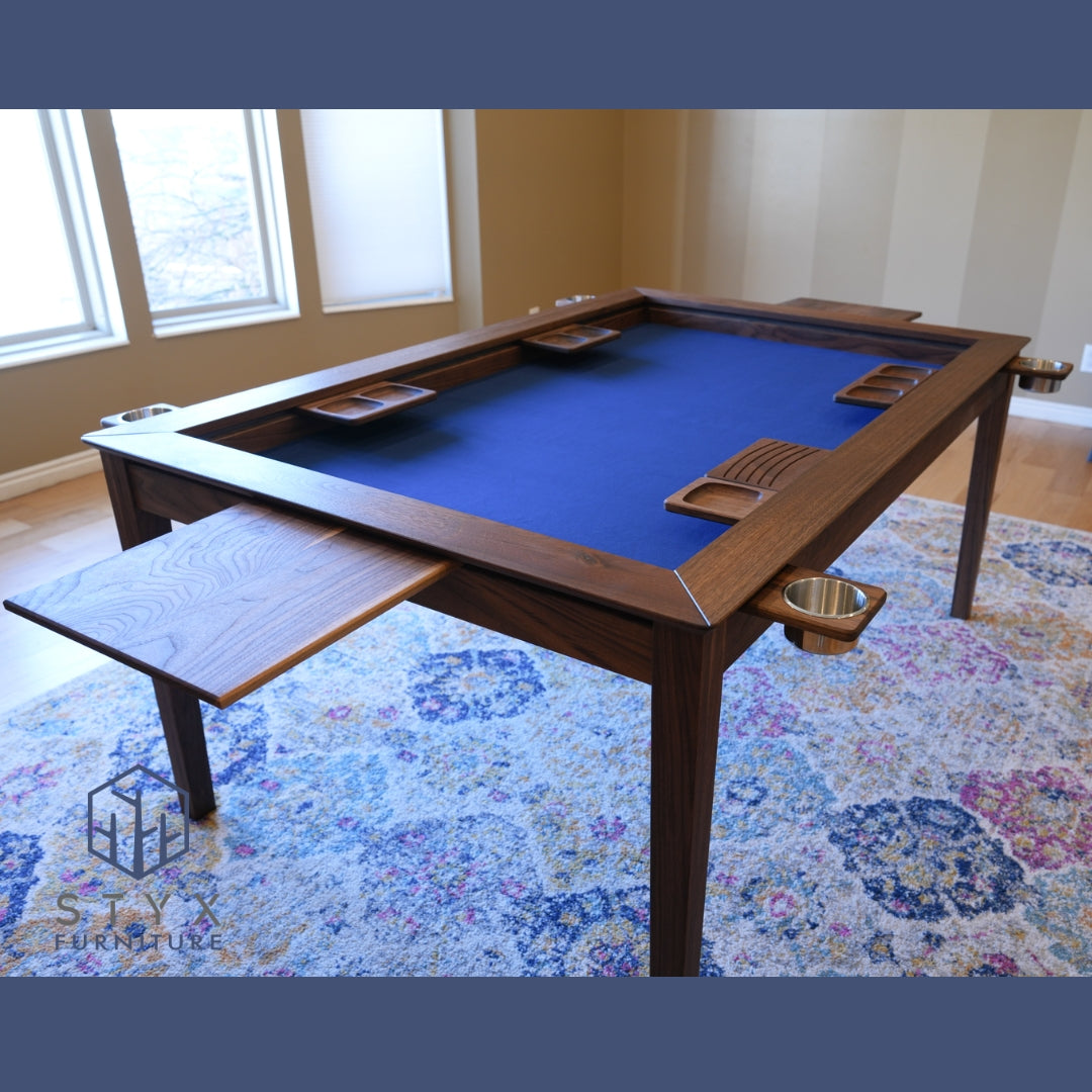 We offer a diverse range of tables, available in a variety of hardwoods, each piece unique and tailored to your specific lifestyle needs. Our velvet gaming surfaces, available in six vibrant colors, are a perfect blend of luxury and comfort. We also provide a unique leaf tree designed specifically to hold table leaves, enhancing the functionality of our products.