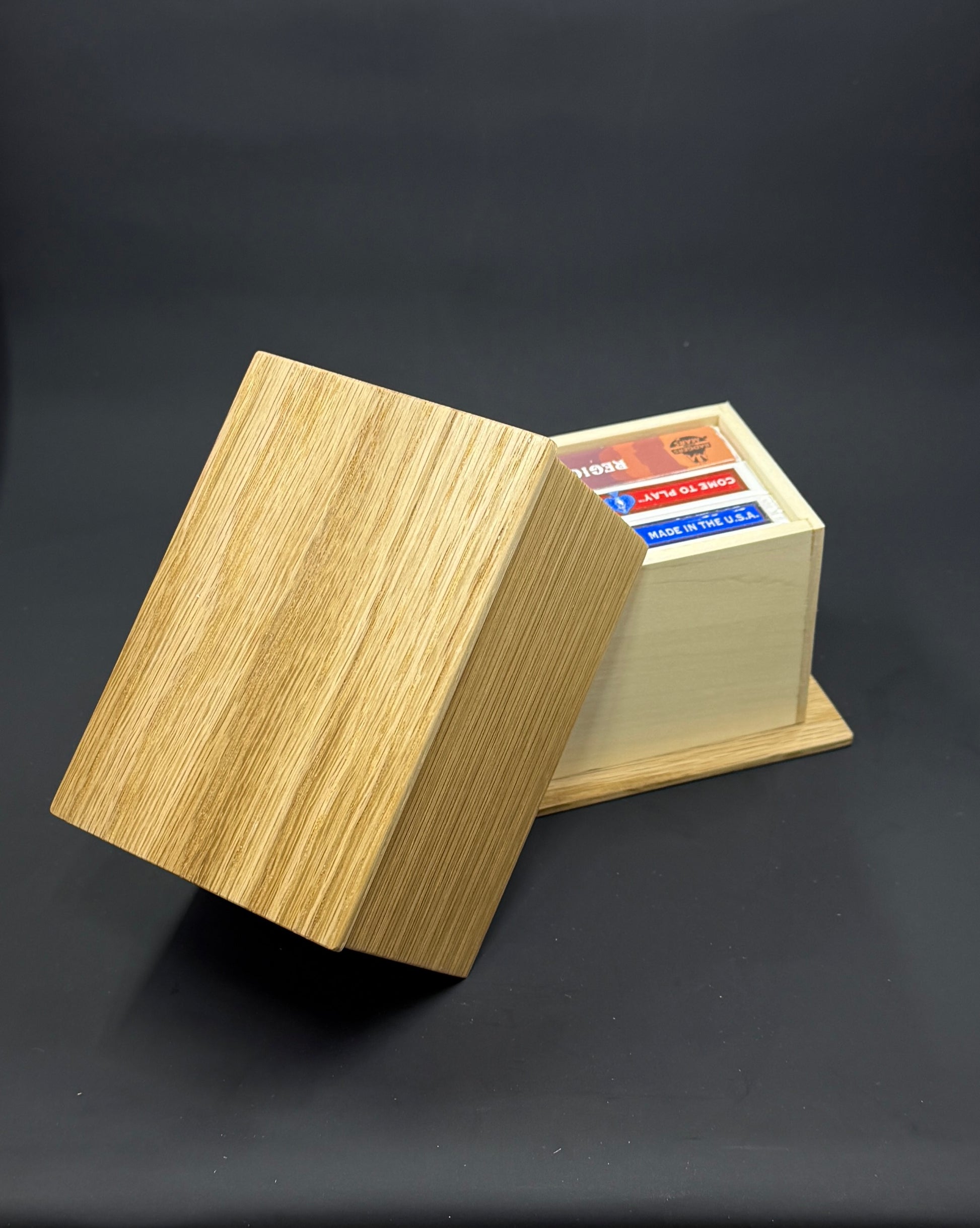 Elevate your card game with this handcrafted wooden card box, designed for card enthusiasts who value both beauty and function. Made from rich white oak paired with warm basswood tones, each box is uniquely crafted—no two are exactly alike.
