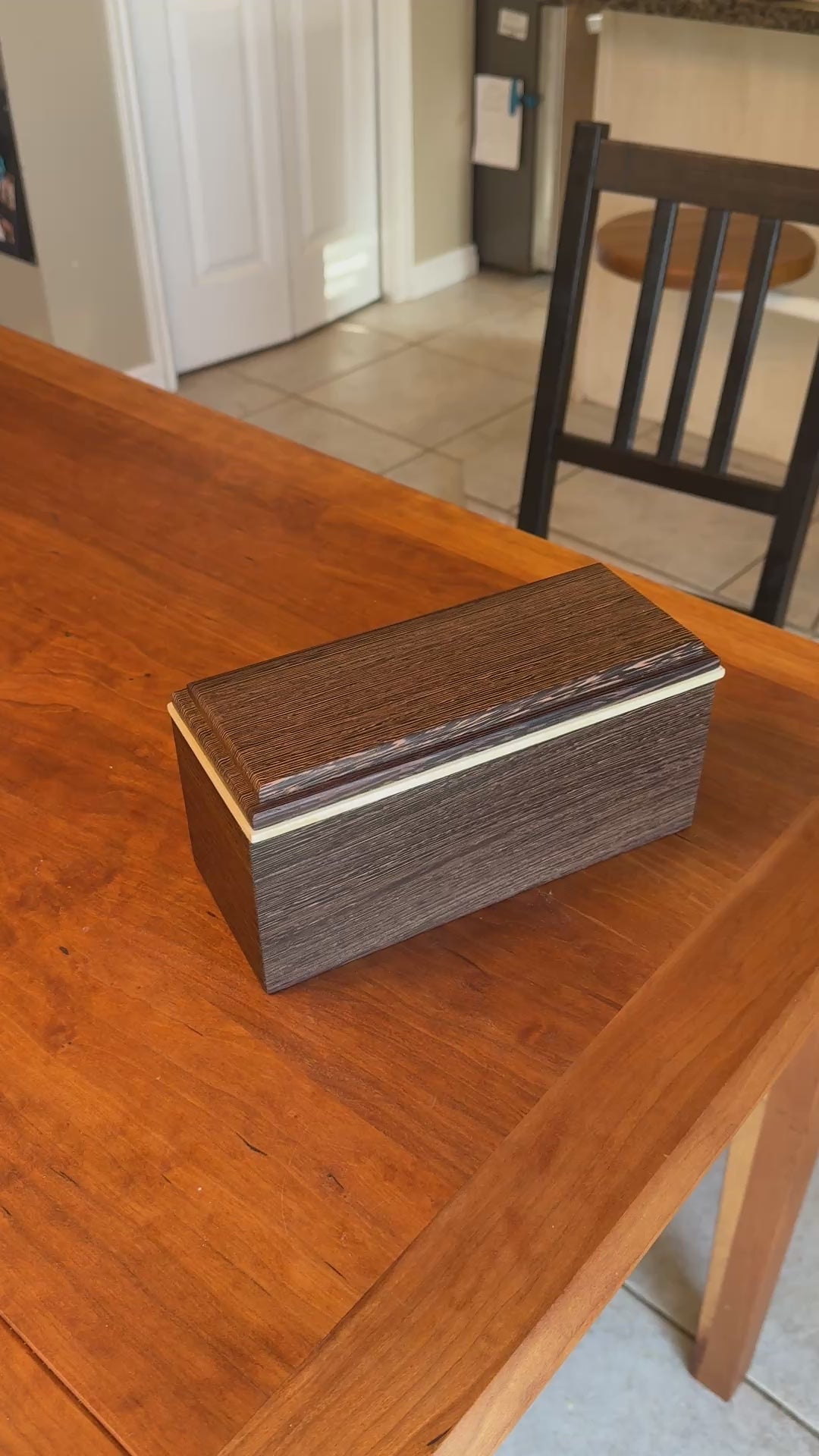 Crafted from solid Wenge and Basswood with Baltic Birch Plywood for the bottom insert. Hand finished with shellac (food safe) and polishing wax, both on the outside only.