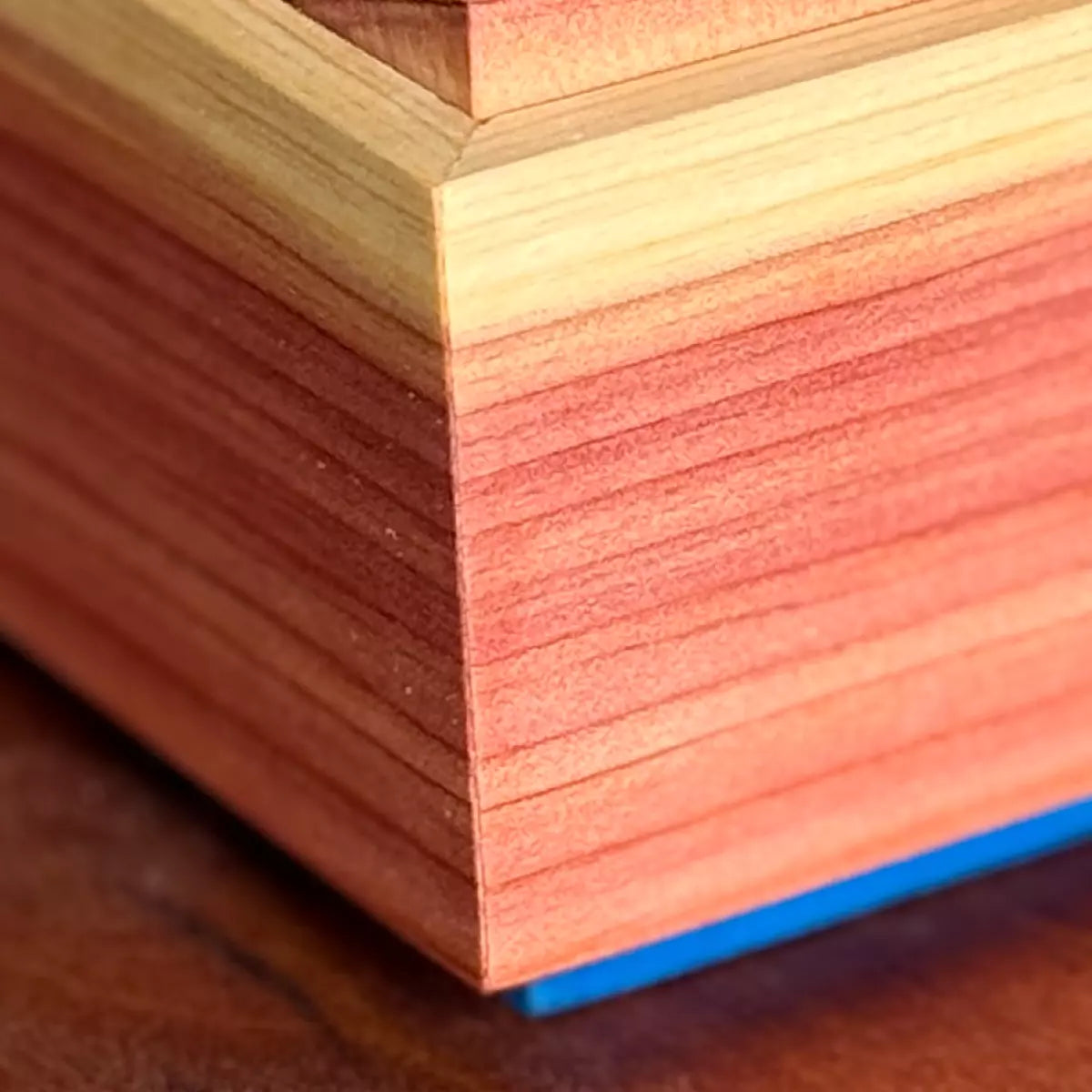 Stash your treasures in style with this charming handmade wooden jewelry box! Crafted from aromatic cedar and finished with a lovely blue milk-paint base, it's as delightful to look at as it is functional. The natural wood top gleams with protective shellac and paste wax, creating a smooth, touchable surface that only gets better with age. At 6" long, 4" wide, and 3" tall, it's the perfect size for rings, necklaces, and keepsakes. Each piece is uniquely handmade, making it a one-of-a-kind addition to any dresser or nightstand.